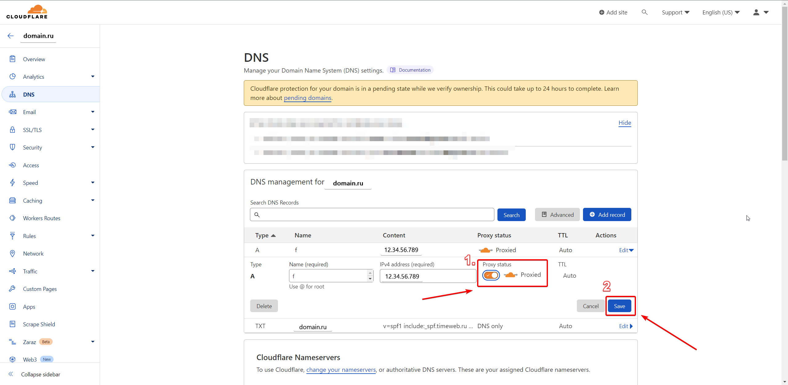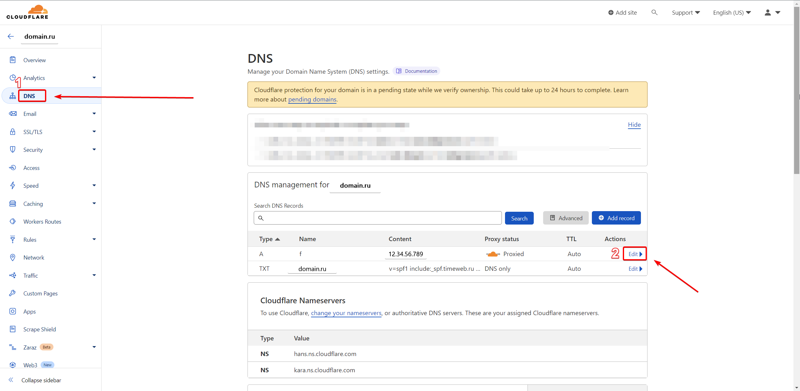 Включение/отключение proxy, а также редактирование ресурсных записей производится в разделе DNS. Нажмите на Edit рядом с А-записью.