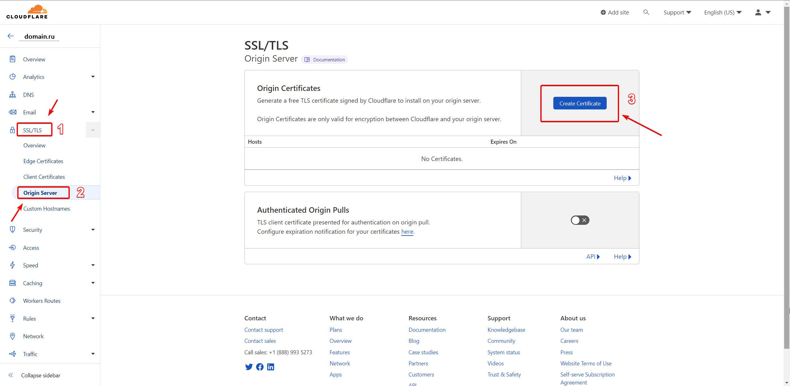 Установить SSL можно в разделе SSL/TLS. В разделе Origin Server можно сформировать бесплатный SSL-сертификат от Cloudflare для последующей установки на сервере.