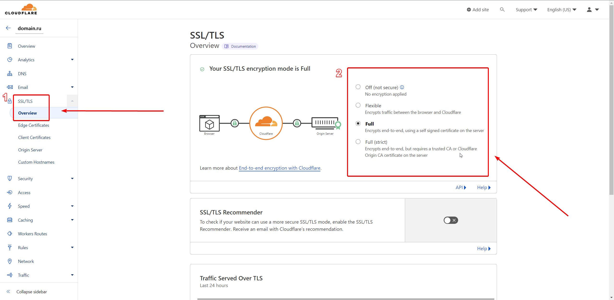 - Full — данные шифруются как между клиентом и Cloudflare, так и между Cloudflare и хостингом, на хостинге может быть установлен самоподписанный сертификат. Этот способ подойдет, если на стороне хостинга будет устанавливаться Let’s Encrypt.