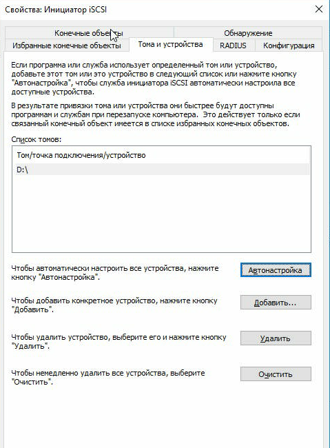 2.4. На вкладке «Тома и устройства» нажмите «Автонастройка». После этого ниже в «Списке томов» будут автоматически добавлены все доступные устройства.