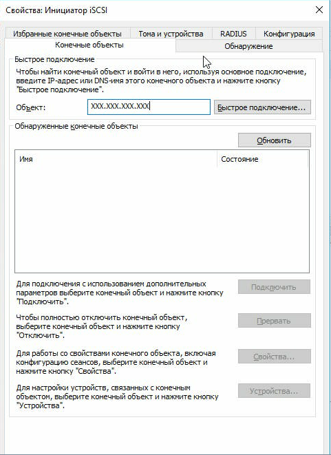 2.2. В разделе «Свойства» перейдите на вкладку «Конечные объекты». В поле «Объект» введите выданный вам IP-адрес стораджа и нажмите «Быстрое подключение».