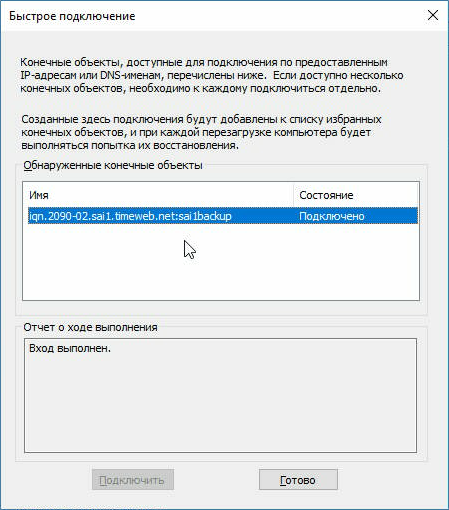 На этом процесс подключения к iSCSI-диску завершен. Диск готов к работе.