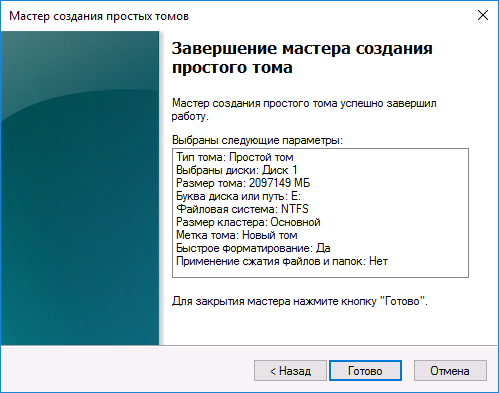 3.9. Нажмите кнопку «Готово» и убедитесь в завершении форматирования тома.